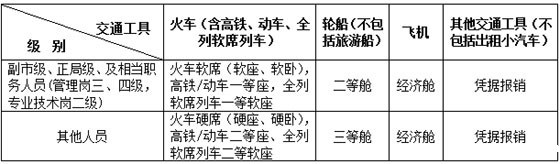 第五条出差人员应当按照规定等级乘坐交通工具,凭据报销城市间交通费。未按规定等级乘坐交通工具的,超支部分自理。到出差目的地有多种交通工具可选择时,出差人员在不影响公务、确保安全的前提下,应当选乘经济便捷的交通工具。出差人员乘坐交通工具的等级见下表:
